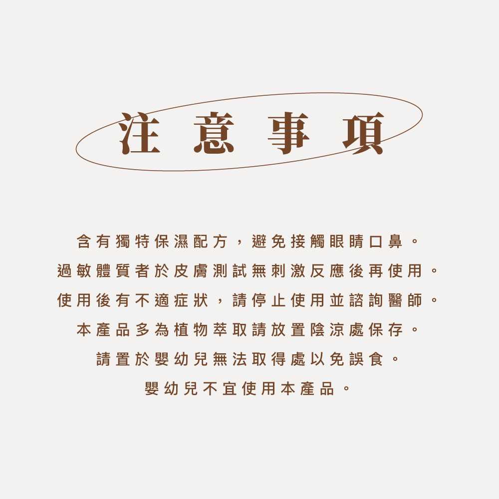 注意事項:本產品是多種植物萃取配方,如有沈澱或顏色均屬正常現象,使用前請先搖一搖。另外為避免產品變質,開瓶後請存放在陰涼處,幼童無法取得的地分。產品避免接觸眼,皮膚品感者請先試用於手部肌膚,無過敏反應後再使用。使用後如有不適請立即停止使用並諮詢醫師