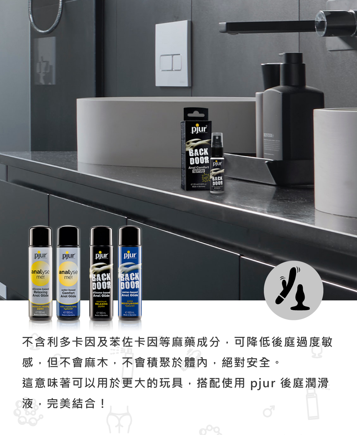 不含利多卡因及苯佐卡因等麻藥成分,可降低後庭過度敏感,但不會麻木,不會積聚於體內,絕對安全。這意味著可以用於更大的玩具,搭配使用 pjur BACK DOOR 激情後庭潤滑液,完美結合!