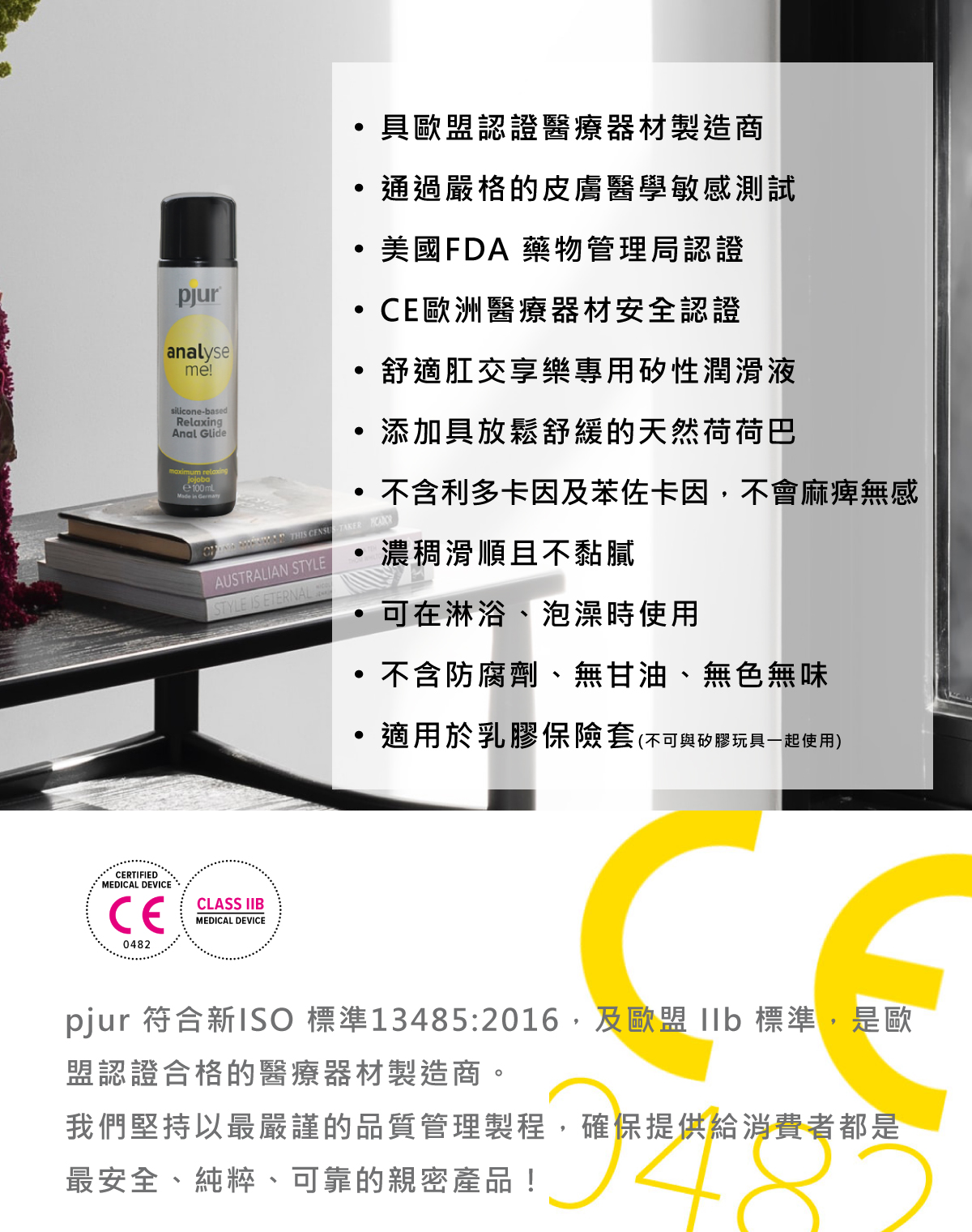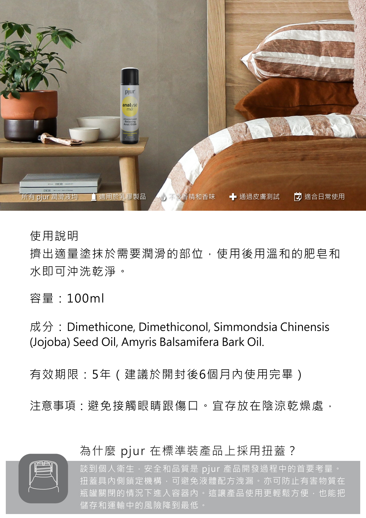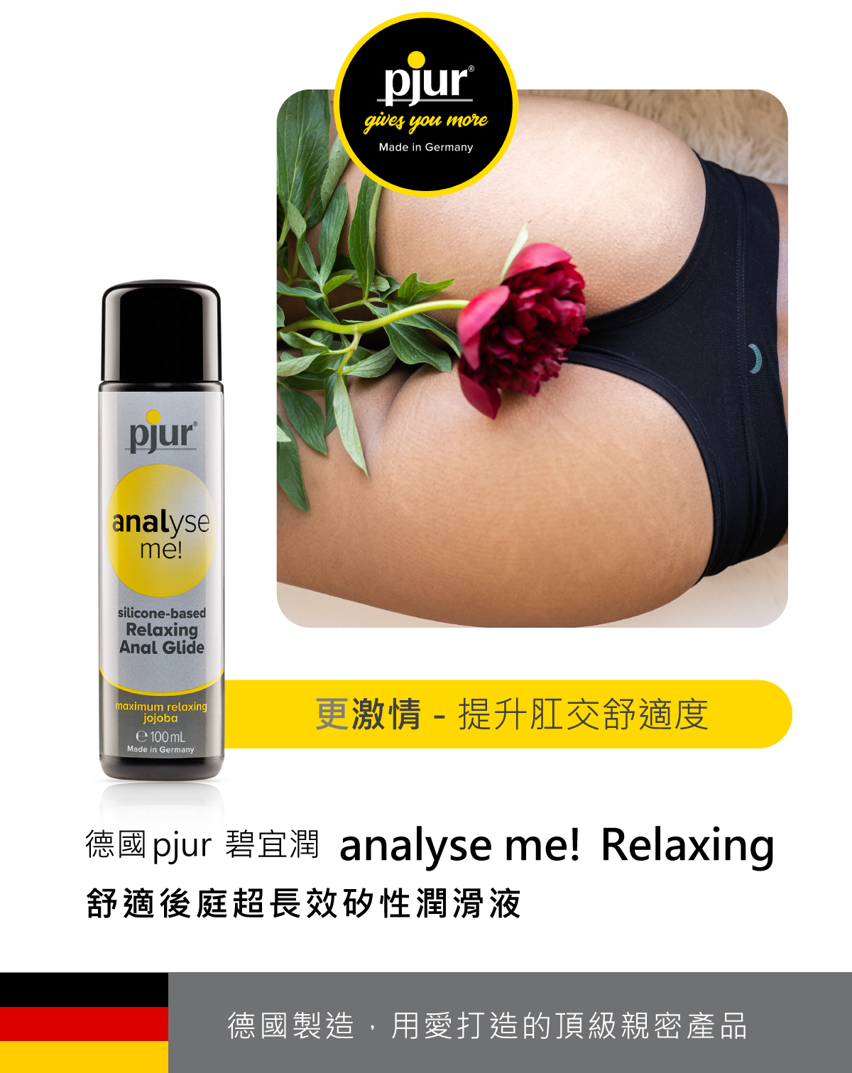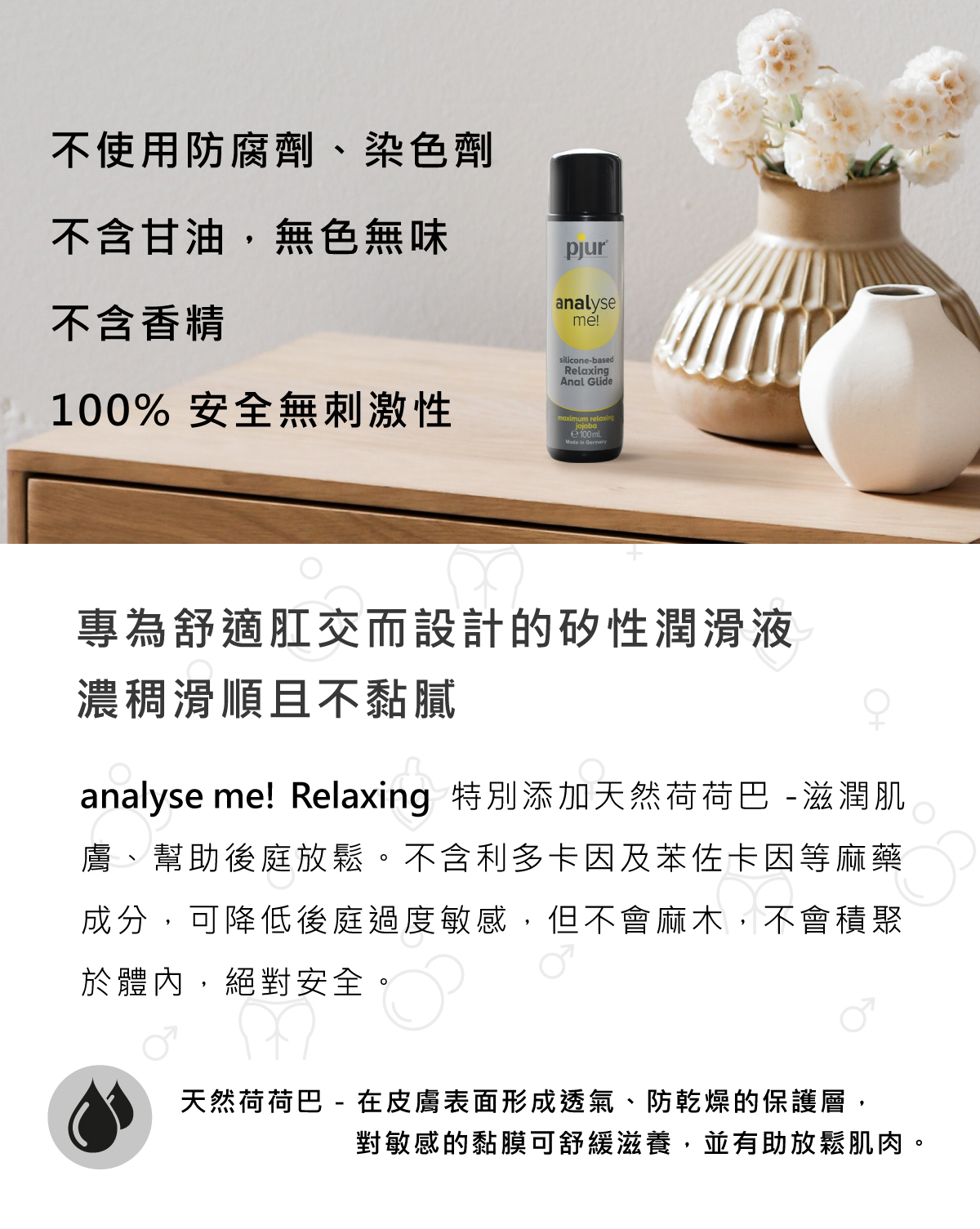analyse me! Relaxing 矽性-專為舒適肛交而設計的矽性潤滑液,特別添加天然荷荷巴 -荷荷巴是一種上等的護膚油。它能在皮膚表面形成透氣、防乾燥的保護層,對敏感的黏膜可舒緩滋養,並有助舒緩後庭肌膚壓力。不含利多卡因及苯佐卡因等麻藥成分,可降低後庭過度敏感,但不會麻木,不會積聚於體內,絕對安全。