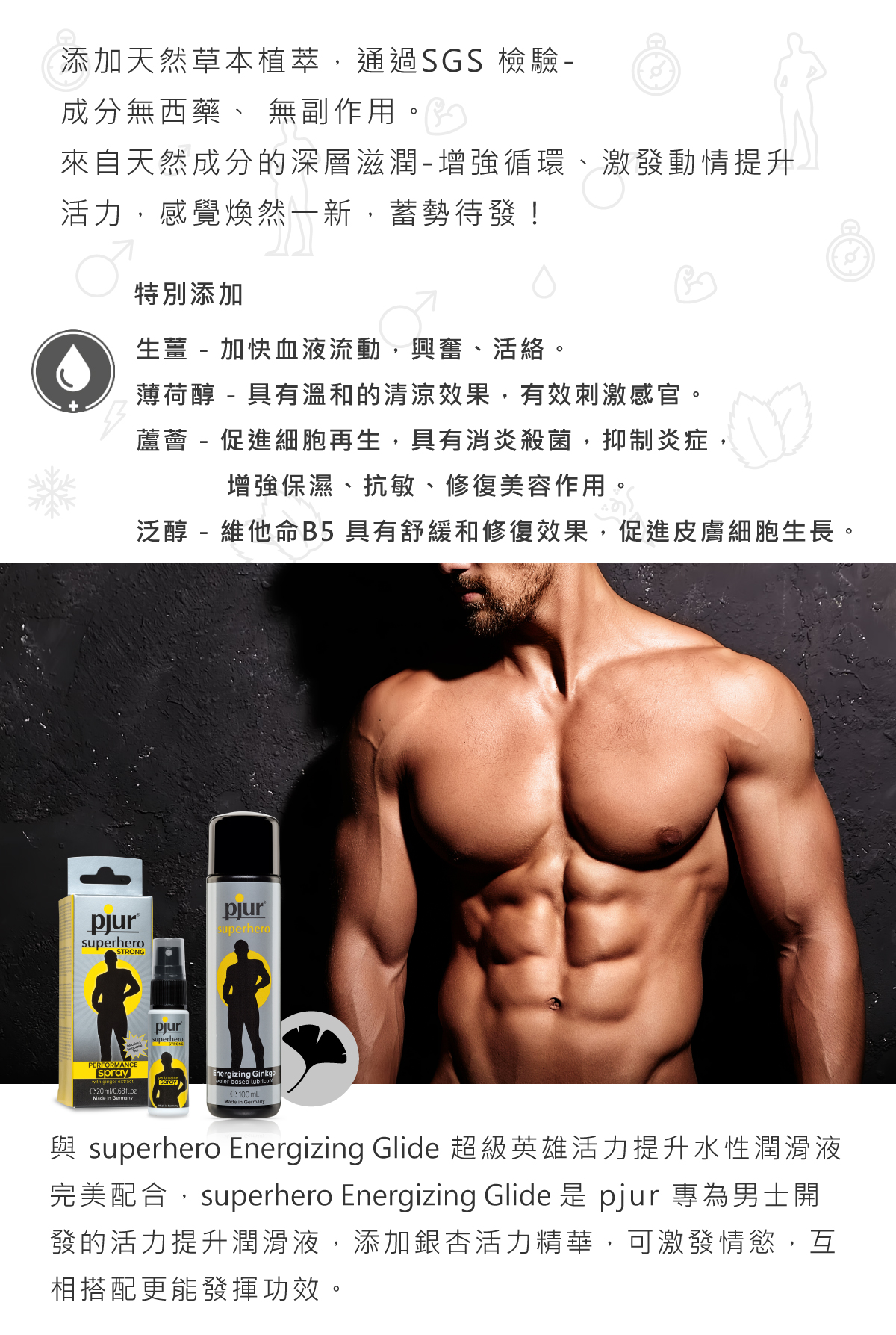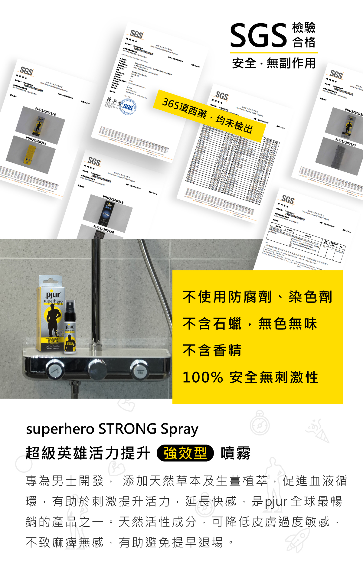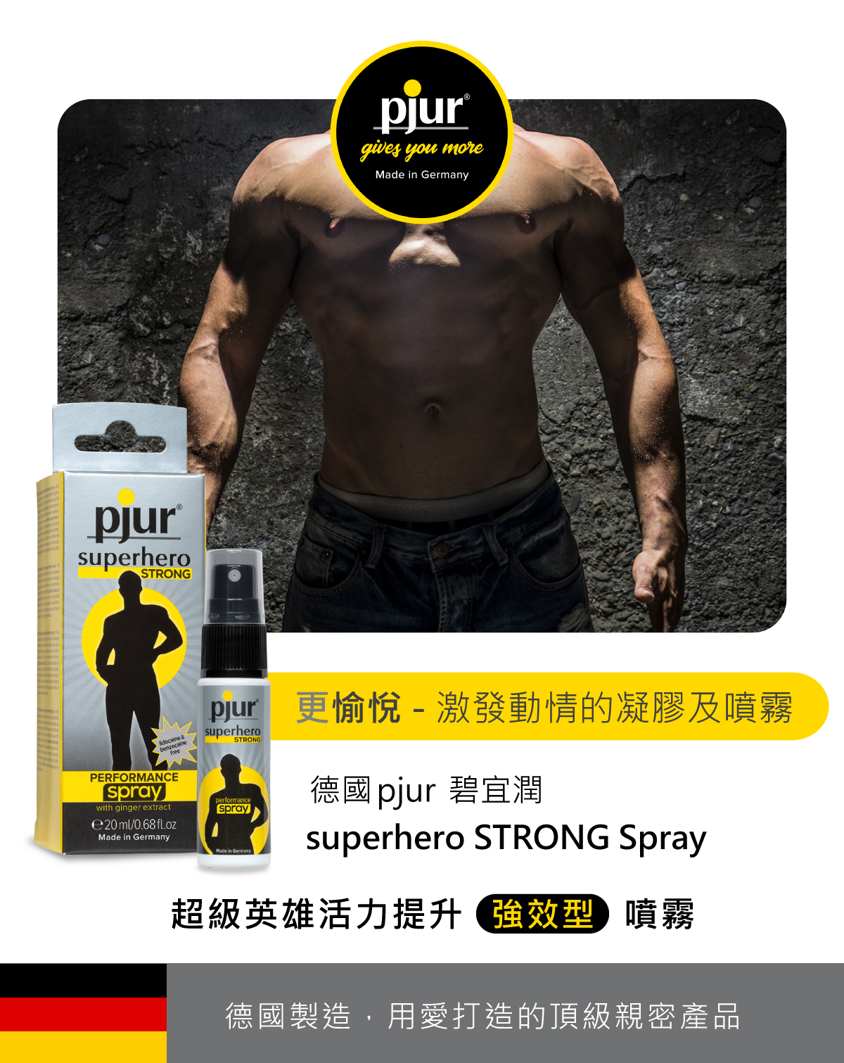 專為男士開發的 superhero STRONG Spray 超級英雄活力提升強效型噴霧,添加天然草本及生薑植萃,促進血液活絡,有助於刺激提升活力,延長快感,是pjur 全球最暢銷的產品之一。