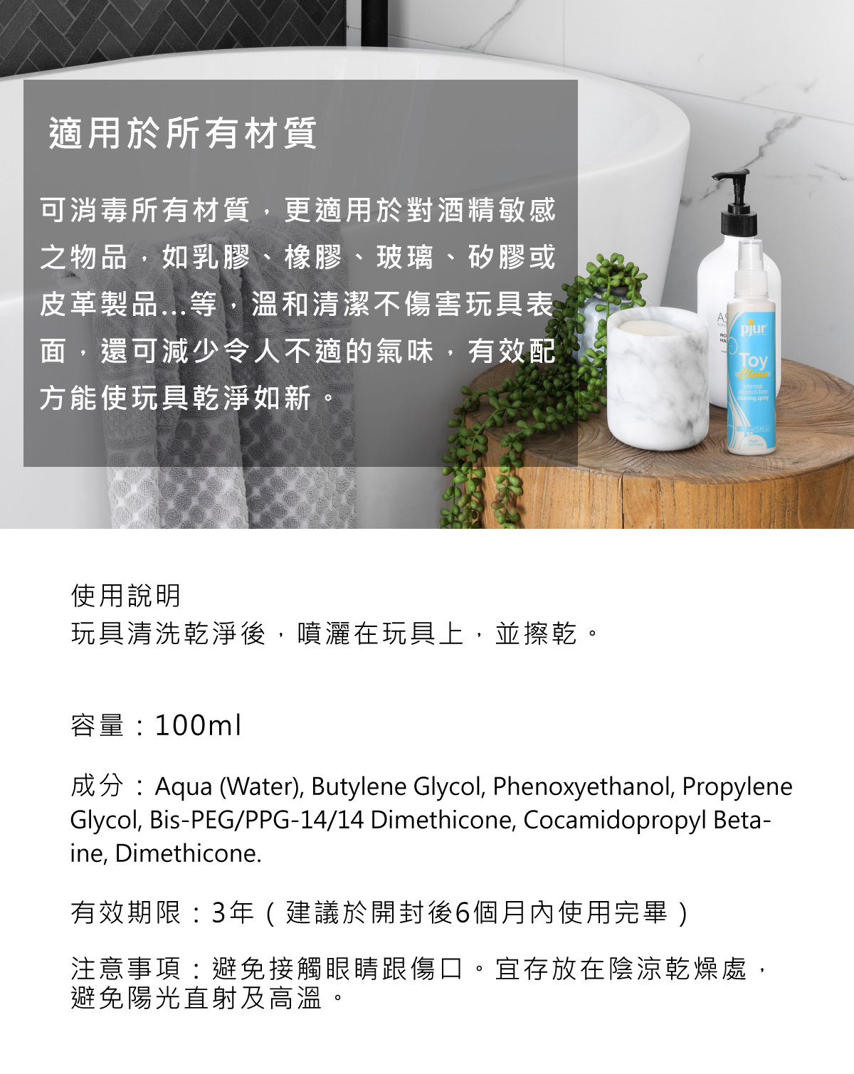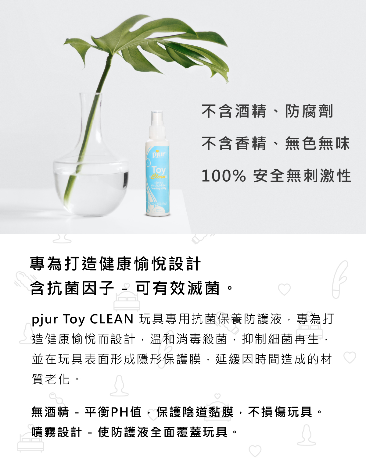 pjur TOY CLEAN 玩具專用抑菌保養防護液,專為打造健康愉悅而設計,抑制細菌再生,並在玩具表面形成隱形保護膜,延緩因時間造成的材質老化。