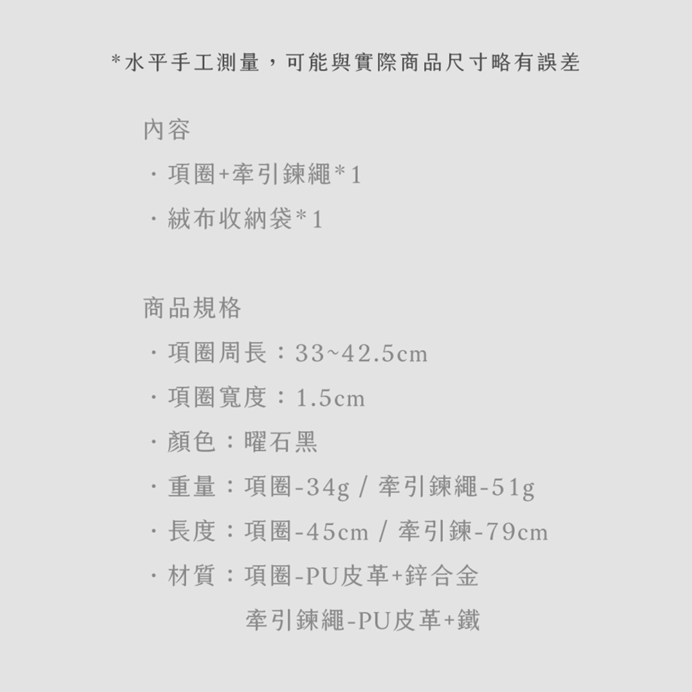 產品材質::項圈-PU皮革+鋅合|牽引鍊繩-PU皮革+鐵