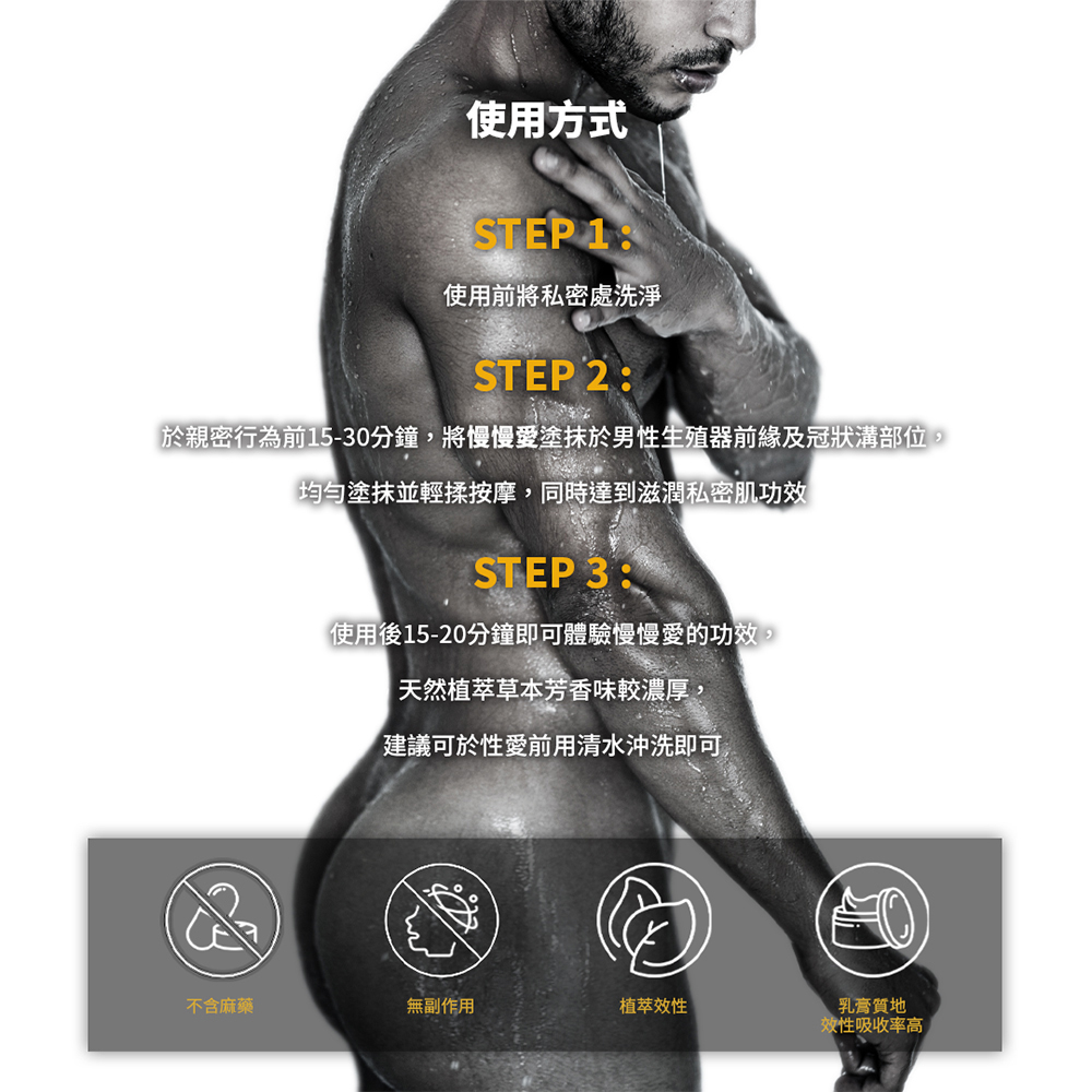 STEP 3:使用後15-20分鐘即可體驗慢慢愛,天然植萃草本芳香味較濃厚,建議可於性愛前用清水沖洗即可