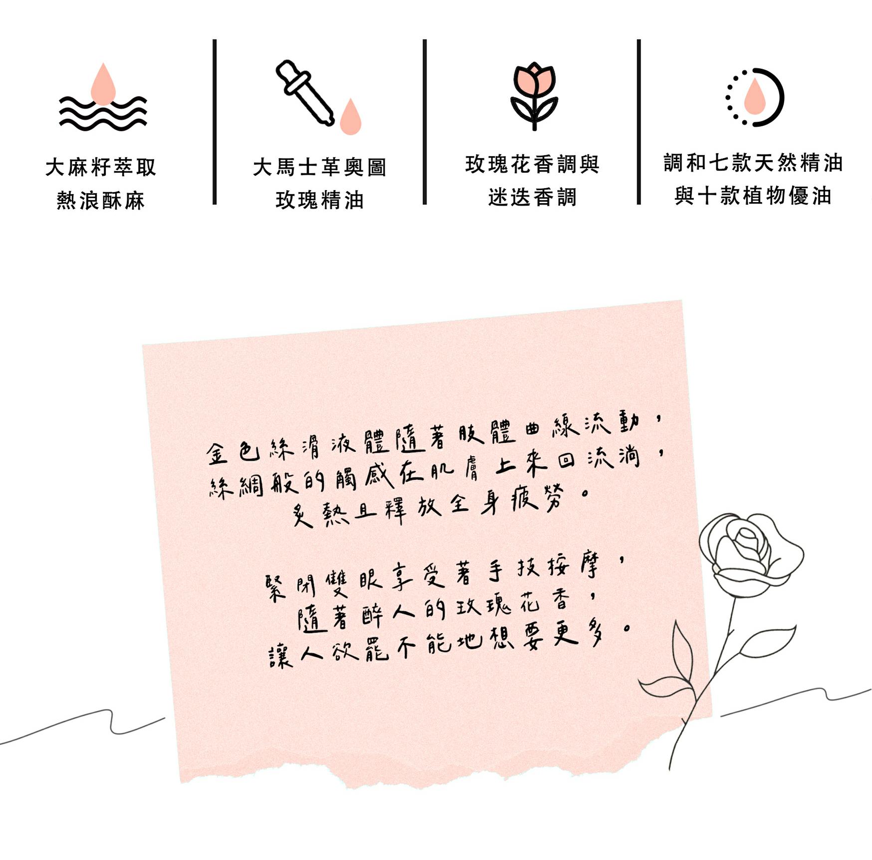 大麻籽萃取成份,絲滑柔順不黏膩,玫瑰花香調與迷迭香調,也是溫柔淡雅的浪漫 調和7款天然精油與10款天然植物基底優油獨家配方,給予肌膚更柔潤的觸感