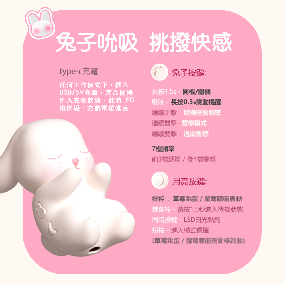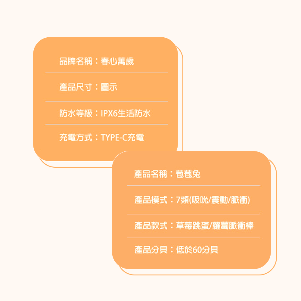 這款名為「春心萬歲 苞苞兔」的吸吮震動玩具,具備7種頻率模式,讓您享受多樣化的感官體驗。共有兩款可愛的免兔設計可供選擇:蘿蔔脈衝款和草莓跳蛋款,萌趣造型融入了趣味與功能性,讓每次使用都充滿驚喜。