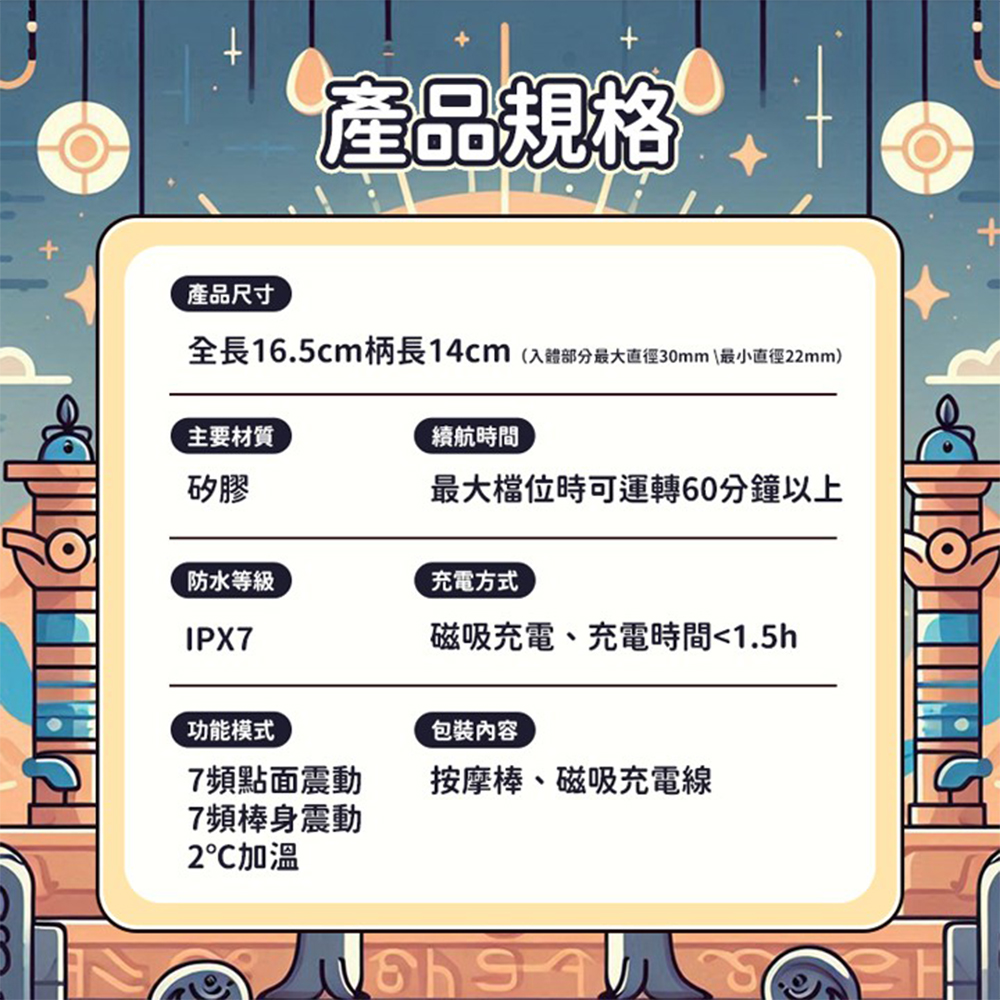 產品功能:7頻點面震動、7頻棒身震動、2℃加溫