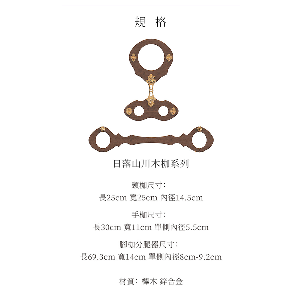 木枷是古代傳統的懲戒道具,帶有強烈的展示性和羞辱性意味。縛栖以中國古代木枷為原型,通過現代化的二次演繹,將懲罰變為慾罰,帶來全新的中式重枷調教體驗。