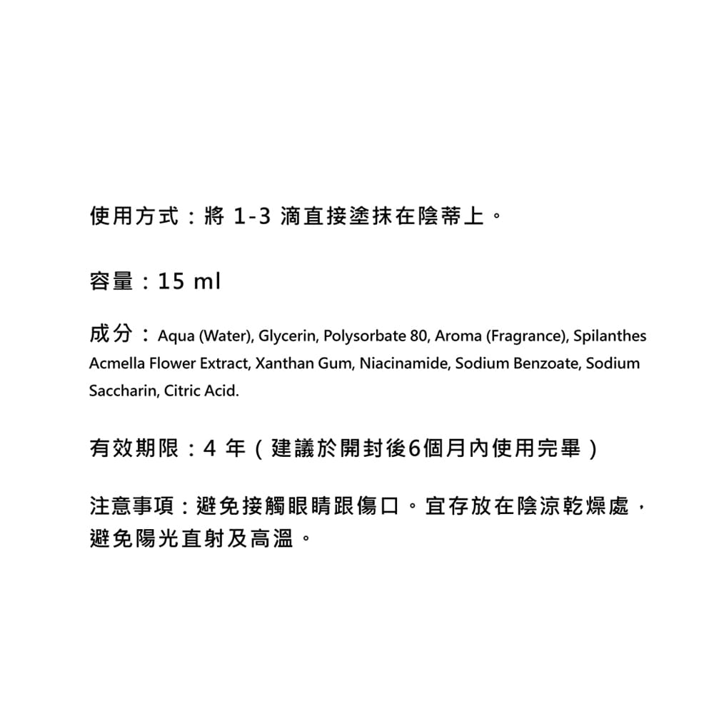 使用方式:將 1-3 滴直接塗抹在陰蒂上。
