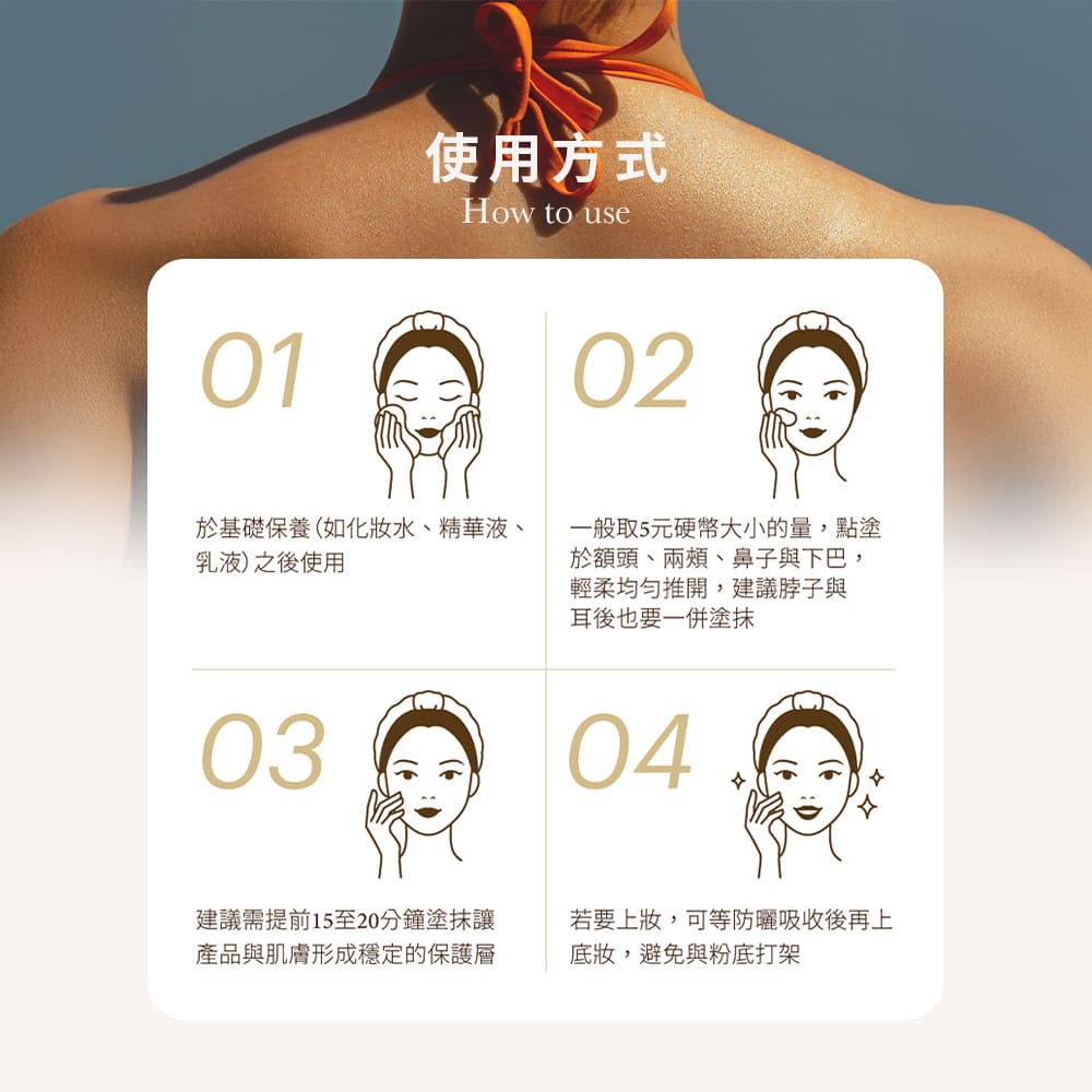 3.建議需提前15至20分鐘塗抹,讓產品與肌膚形成穩定的保護層。