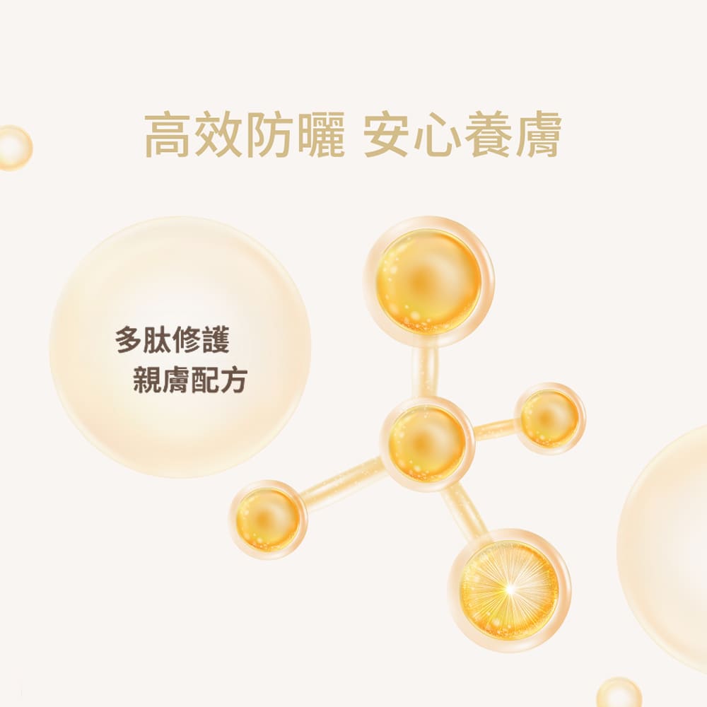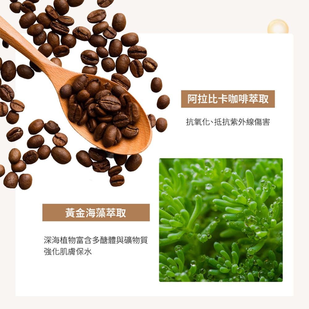 主要成分:物理性防曬劑、多肽修護因子、ECOCERT天然認證阿拉比卡咖啡萃取、黃金海藻萃取、軟毛松藻萃取、米發酵萃取、黃芩萃取。