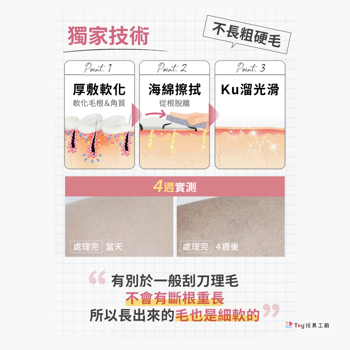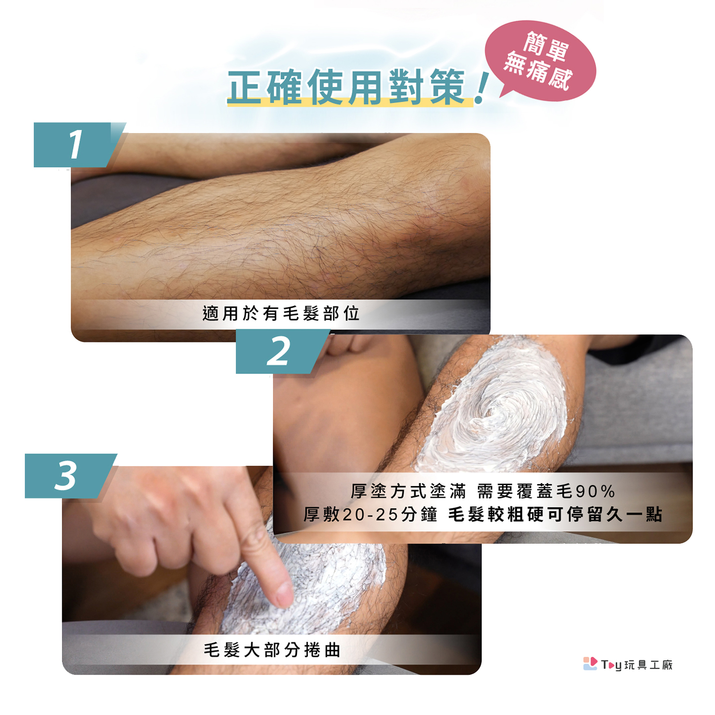 步驟一:擠出適量的Ku溜零毛髮霜在欲順理毛髮區域,必須”厚敷”且確實覆蓋毛髮。