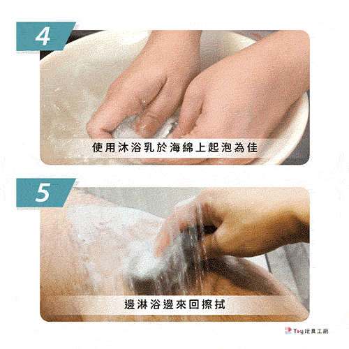 步驟四:一邊淋浴一邊使用起泡的竹炭纖維海綿逆毛來回擦拭直到乾淨為止。