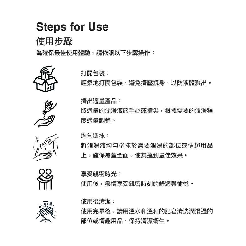 使用說明:Play & Joy品覚潤滑液可依實際需要重複使用於私密部位按摩潤滑保養並增添情趣。本產品不含殺精劑,不具避孕效果。避免接觸眼睛,如有過敏不適,請立即諮詢醫生。