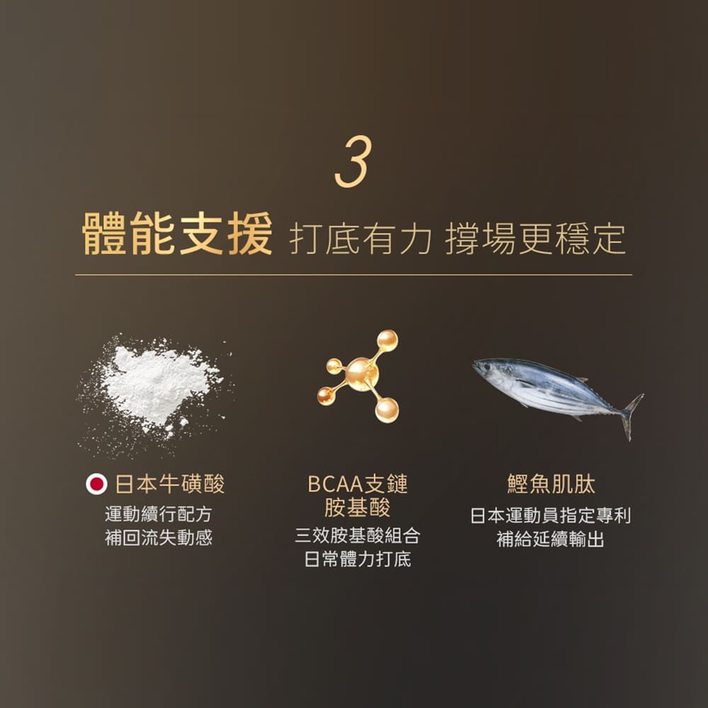 成分:蔗糖、葡萄糖、即溶紅葡萄果汁粉(砂糖、麥芽糊精、紅葡萄濃縮汁、氧化澱粉(樹薯)、檸檬酸、檸檬酸鈉、香料、葡萄皮色素)、麥芽糊精、牛磺酸、硬脂酸鎂、馬卡萃取物、葡萄香料(麥芽糊精、葡萄料(丙二醇、香料)、阿拉伯膠)、微結晶狀a-纖維素、鋅酵母、檸檬酸、綜合植物萃取物(綠咖啡、綠茶、薑黃、 櫻桃酸、藍莓、花椰菜、羽衣甘藍)、南非醉茄萃取物、綜合支鏈胺基酸、鰹魚萃取物、果糖硼酸鈣、透納葉萃取物、蔗糖素(甜味劑)
