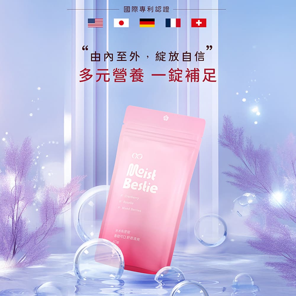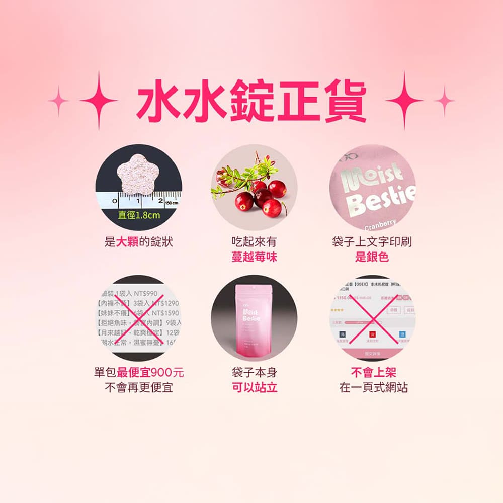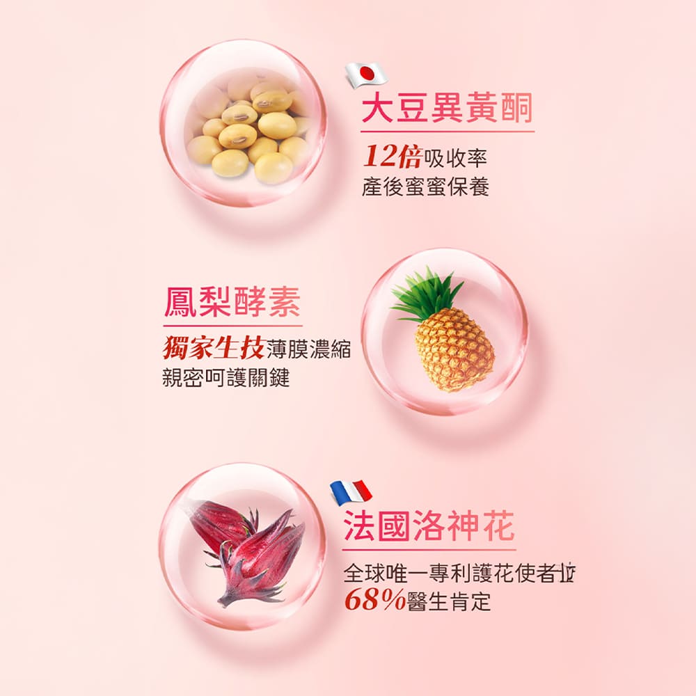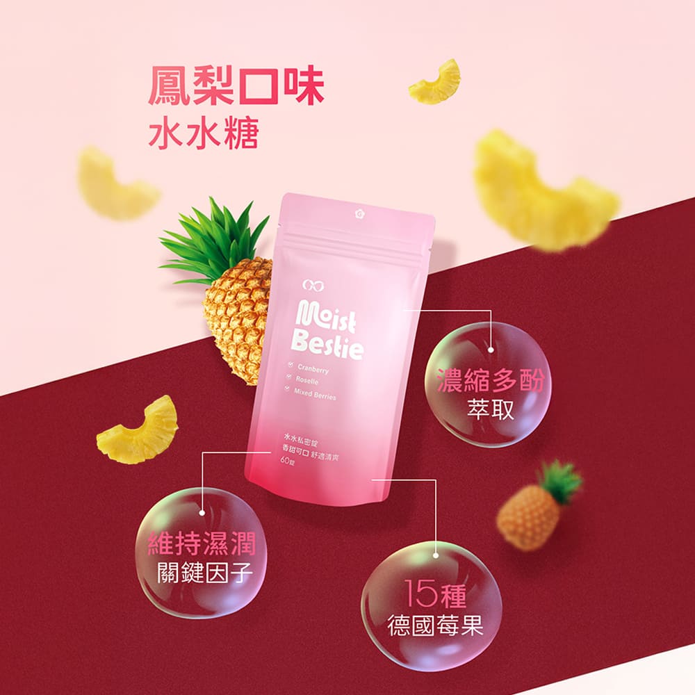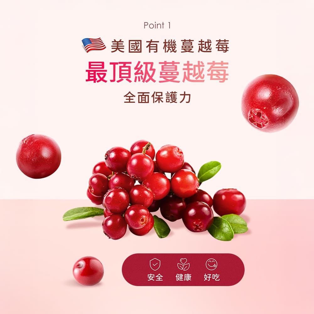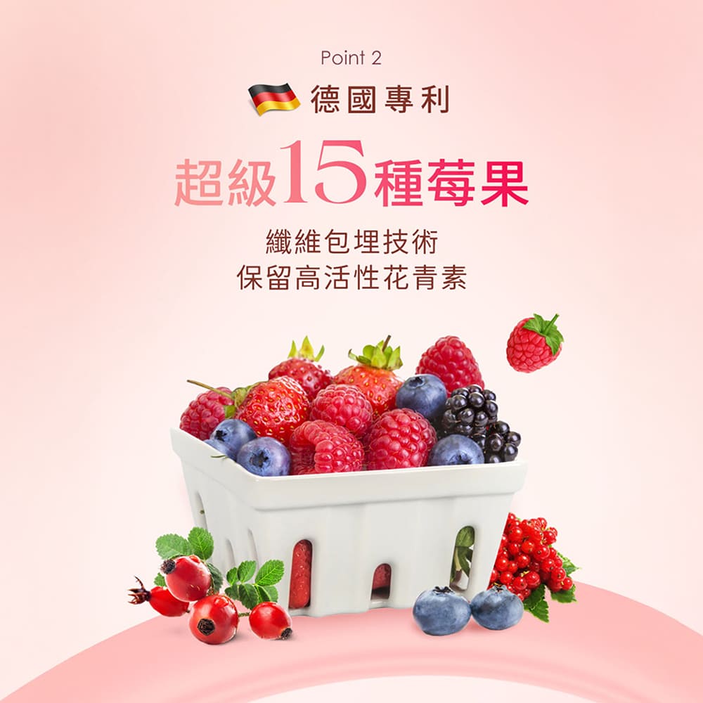 成分:蔗糖、蔓越莓萃取物、鳳梨果汁粉(鳳梨濃縮汁、麥芽糊精、檸檬酸、檸檬酸鈉、香料、蘋果酸、β-胡蘿蔔素)、大豆萃取物、N-乙醯基-葡萄糖胺、莓果發酵粉(玉米來源可溶性纖維、接骨木莓、野櫻梅、巴西梅、山桑子、黑醋栗、覆盆莓、黑莓、藍莓、波森莓、蔓越莓、楊梅、枸杞、草莓、桑葚)、洛神花萃取物、微結晶狀α-纖維素、玫瑰花瓣萃取物 、番石榴葉萃取物、聖潔莓萃取物、鳳梨萃取物(含鳳梨酵素)、蔗糖素(甜味劑)