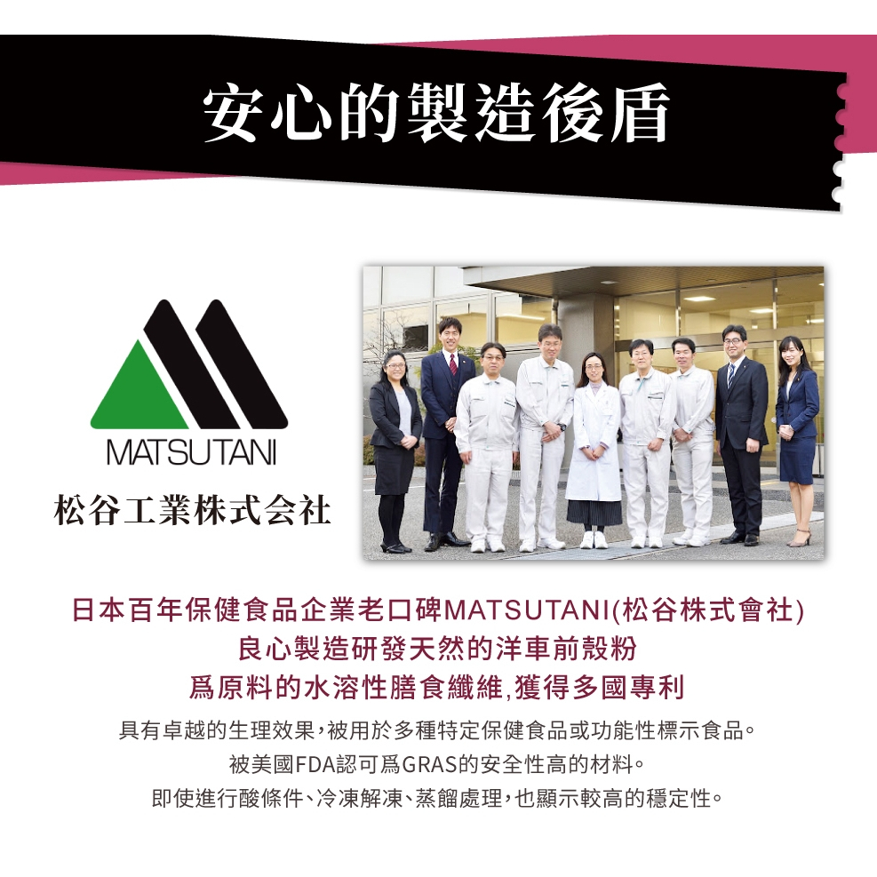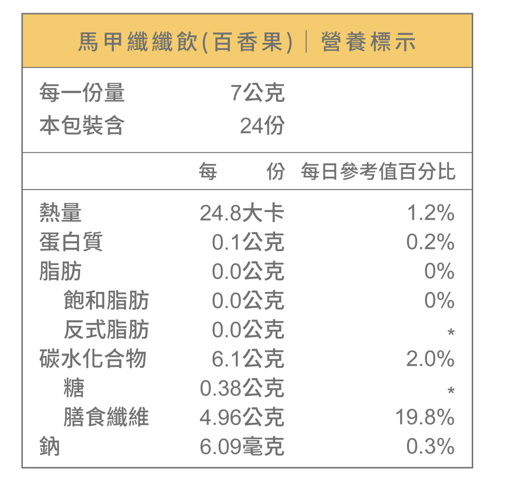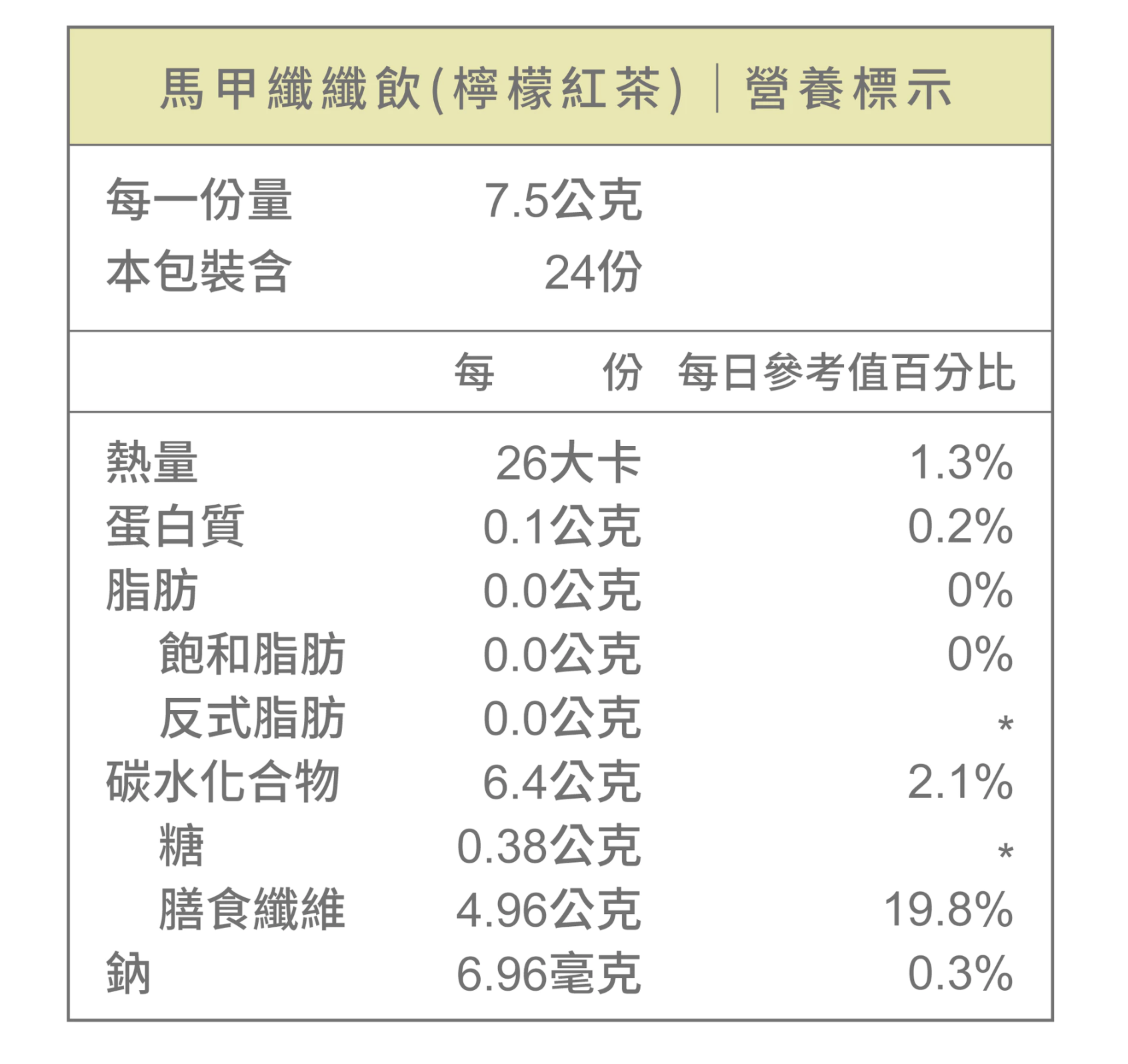 營養標示:每一份量7.5公克,本包裝含24份。每份(熱量26大卡,蛋白質0.1公克,脂肪0公克,飽和脂肪酸0公克,反式脂肪酸0公克,碳水化合物6.4公克,糖0.38公克,膳食纖維4.96公克,鈉6.96毫克)。每日參考值百分比(熱量1.3%,蛋白質0.2%,脂肪0%,飽和脂肪酸0%,反式脂肪酸0%,碳水化合物2.1%,糖*,鈉0.3%,膳食纖維19.8%)。